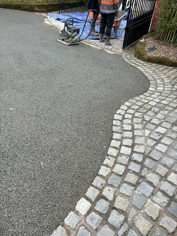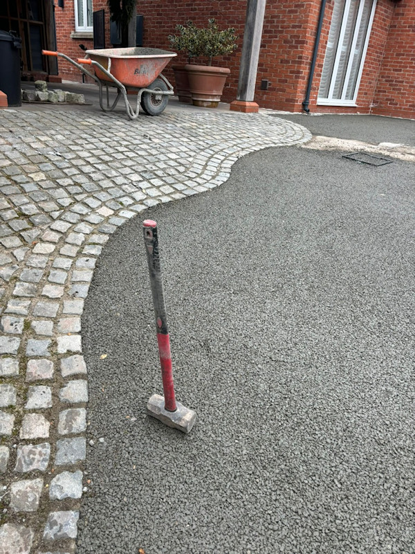 We started this project by clearing the area and mapping out the shape of the driveway. We used granite sets along the edge of the driveway. These nicely framed the driveway, highlighting its shape. We filled in the area that had been cleared with permeable concrete which makes it SUDS compliant. This forms the base for the new driveway in Tarporley. We then covered this with the resin bound aggregate. A layer of crushed glass was sprinkled across the top to prevent slipping and give traction to the surface. As with all our resin bound driveways, we used 7.5 UV stable kits as standard.
